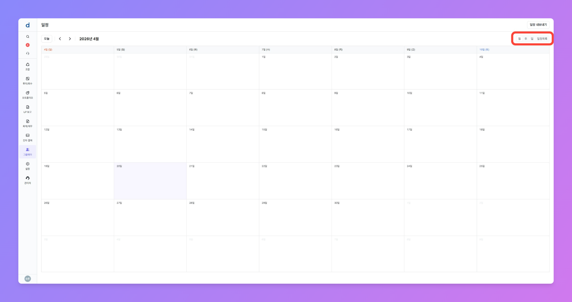 캘린더의 단위를 변경하거나, 등록 일정만 보시려면 우측 상단 버튼을 이용 해주세요.