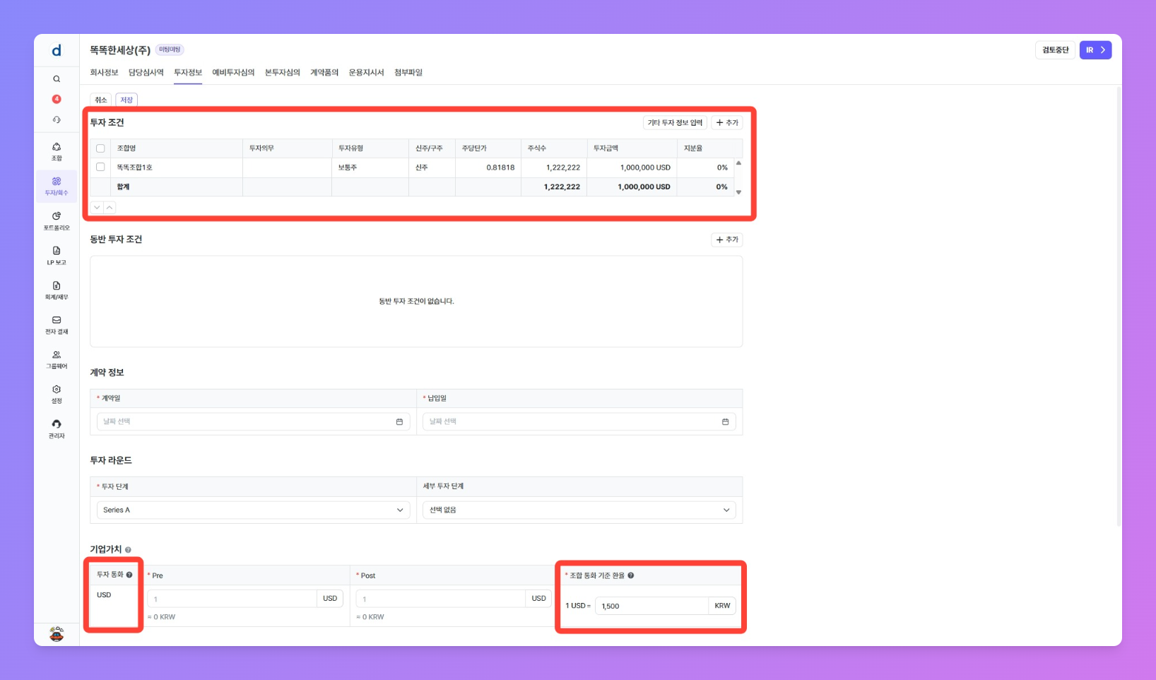 Pre와Post기업가치를 입력해주세요.조합 통화 기준 환율은 투자 통화와 조합 통화가 다른 경우, 조합 통화 기준 환산 금액 계산에 사용됩니다. 같은 통화의 환율은 수정할 수 없고 기준값으로 처리됩니다.