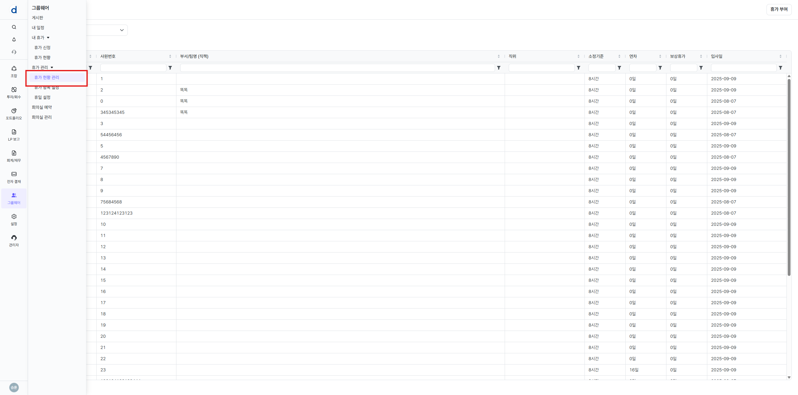 그룹웨어 > 휴가 현황 관리 메뉴를 클릭하여 이동 해주세요.