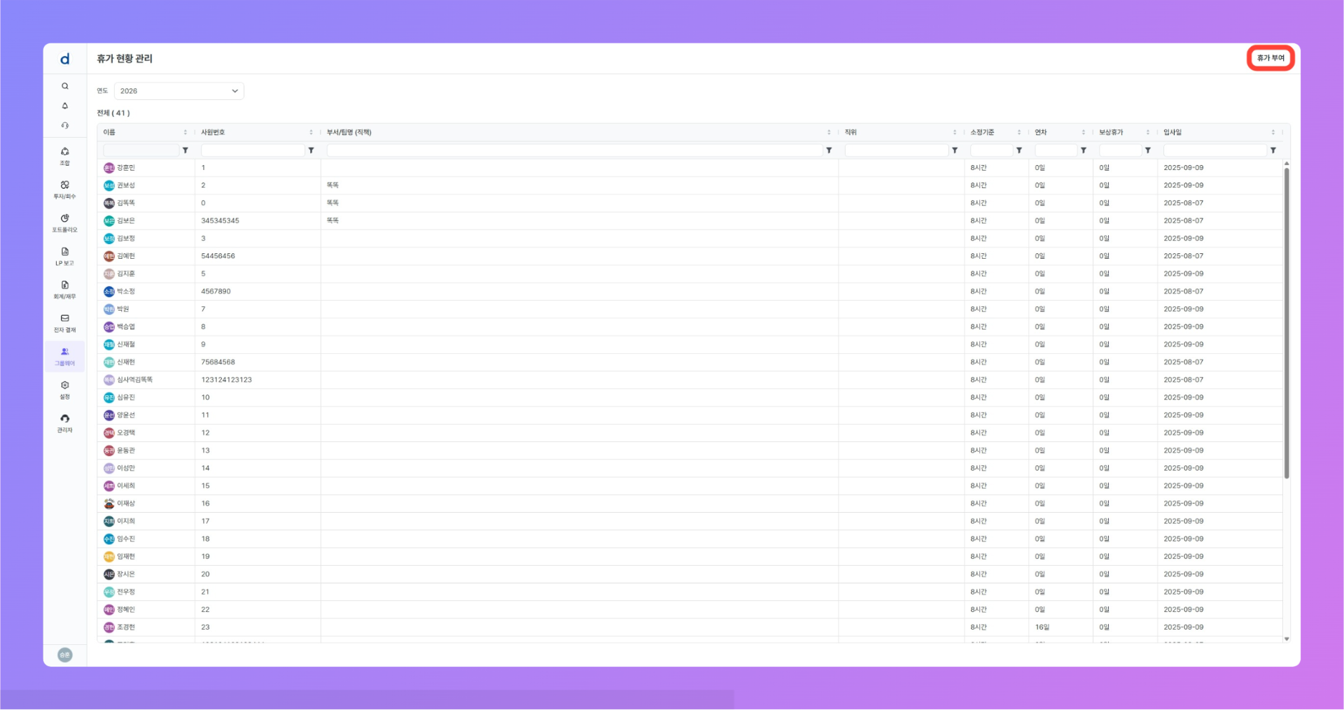 휴가 현황 관리 페이지로 이동 하셨다면, 우측 상단의 [휴가 부여] 버튼을 클릭 해주세요.