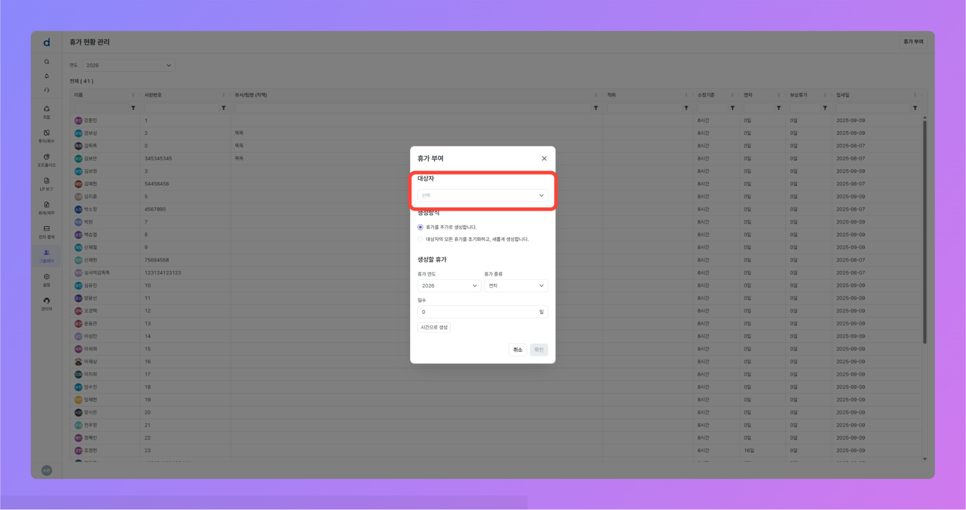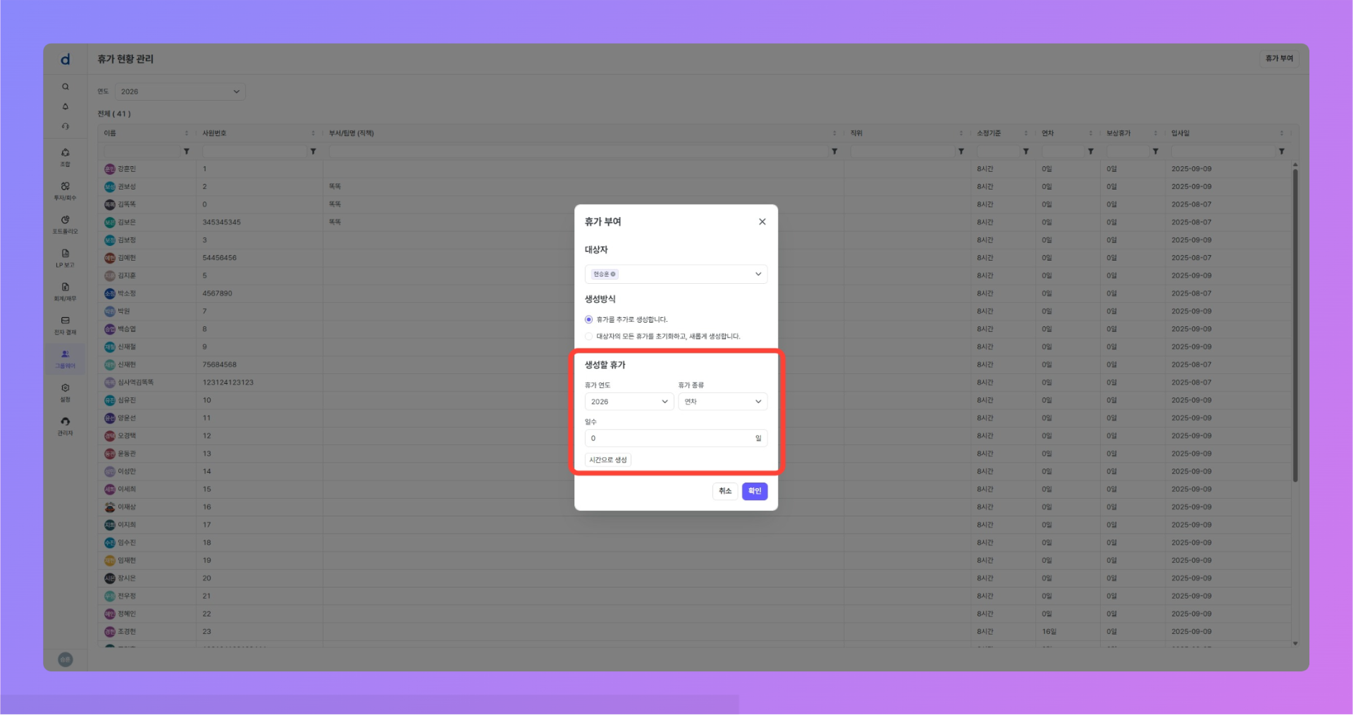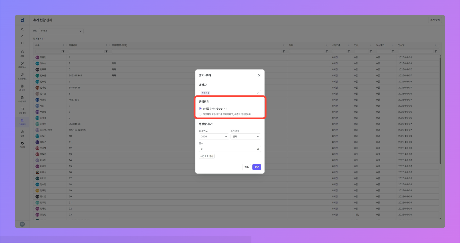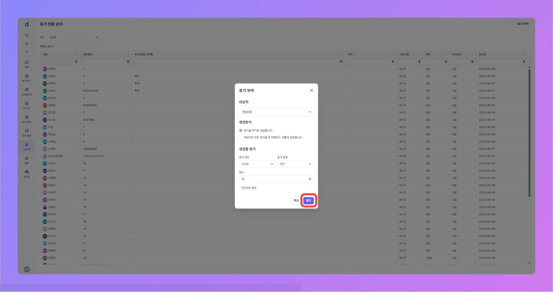 휴가 부여 모달이 열렸다면, 아래의 절차대로 진행합니다.