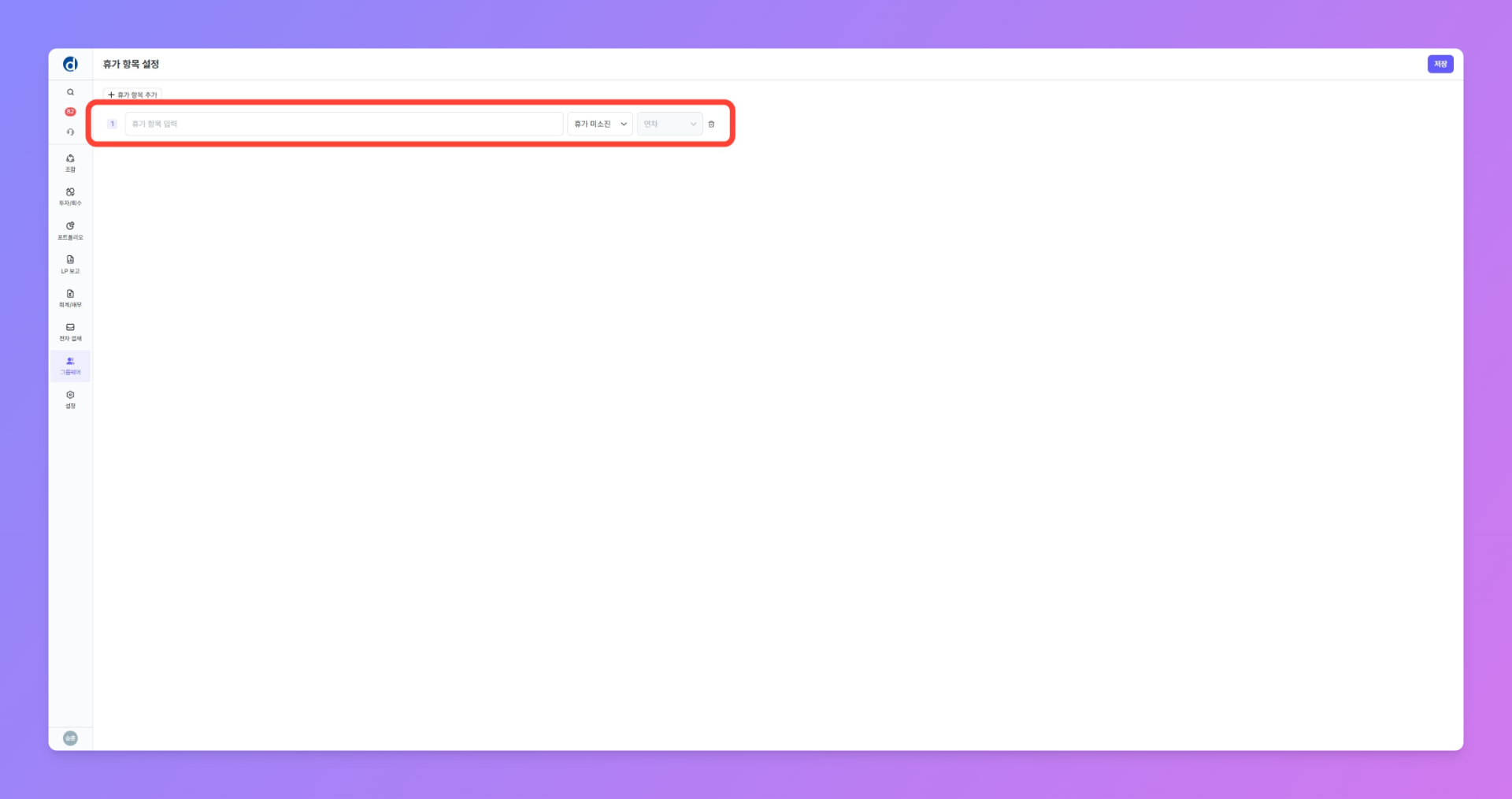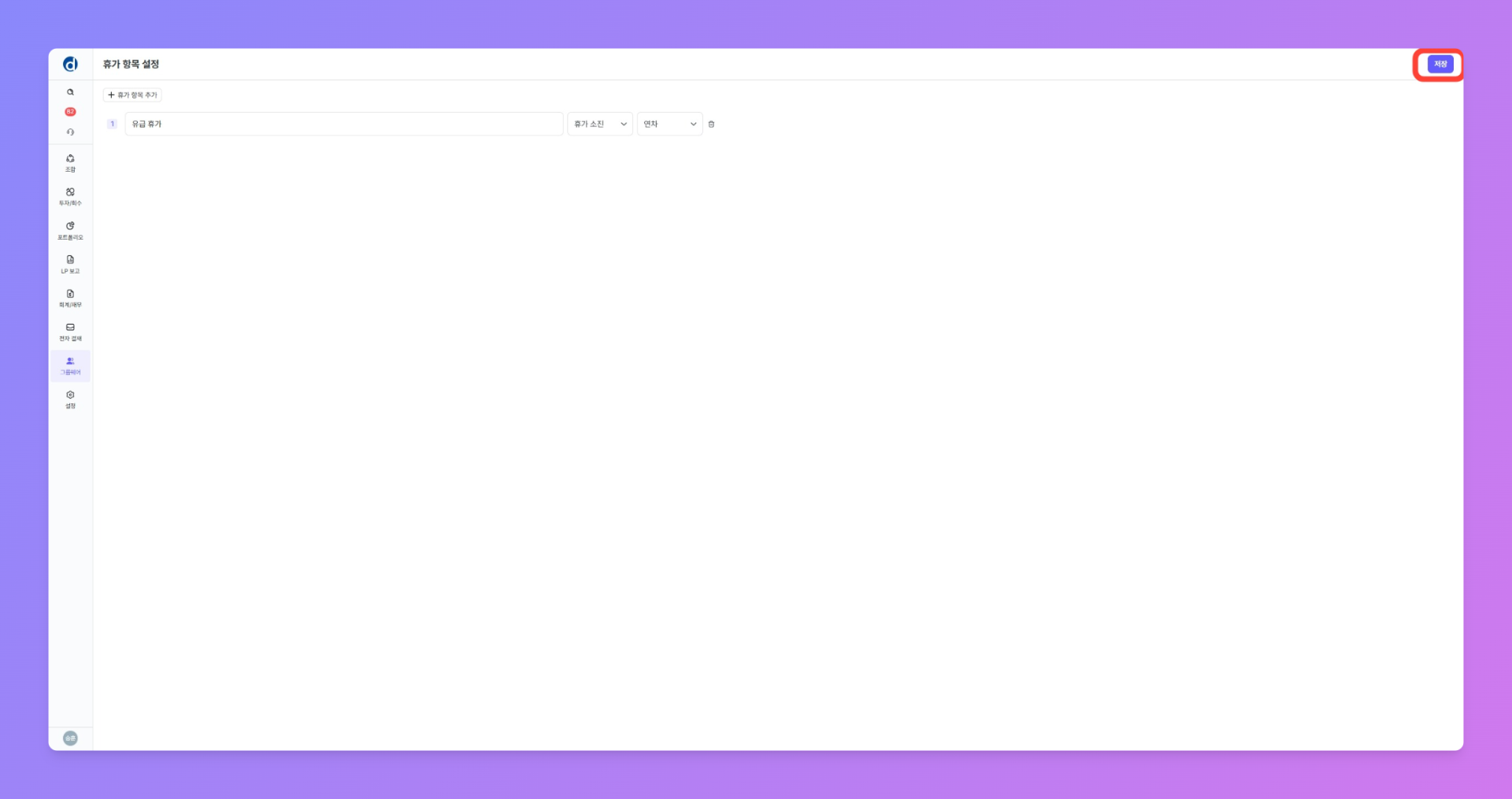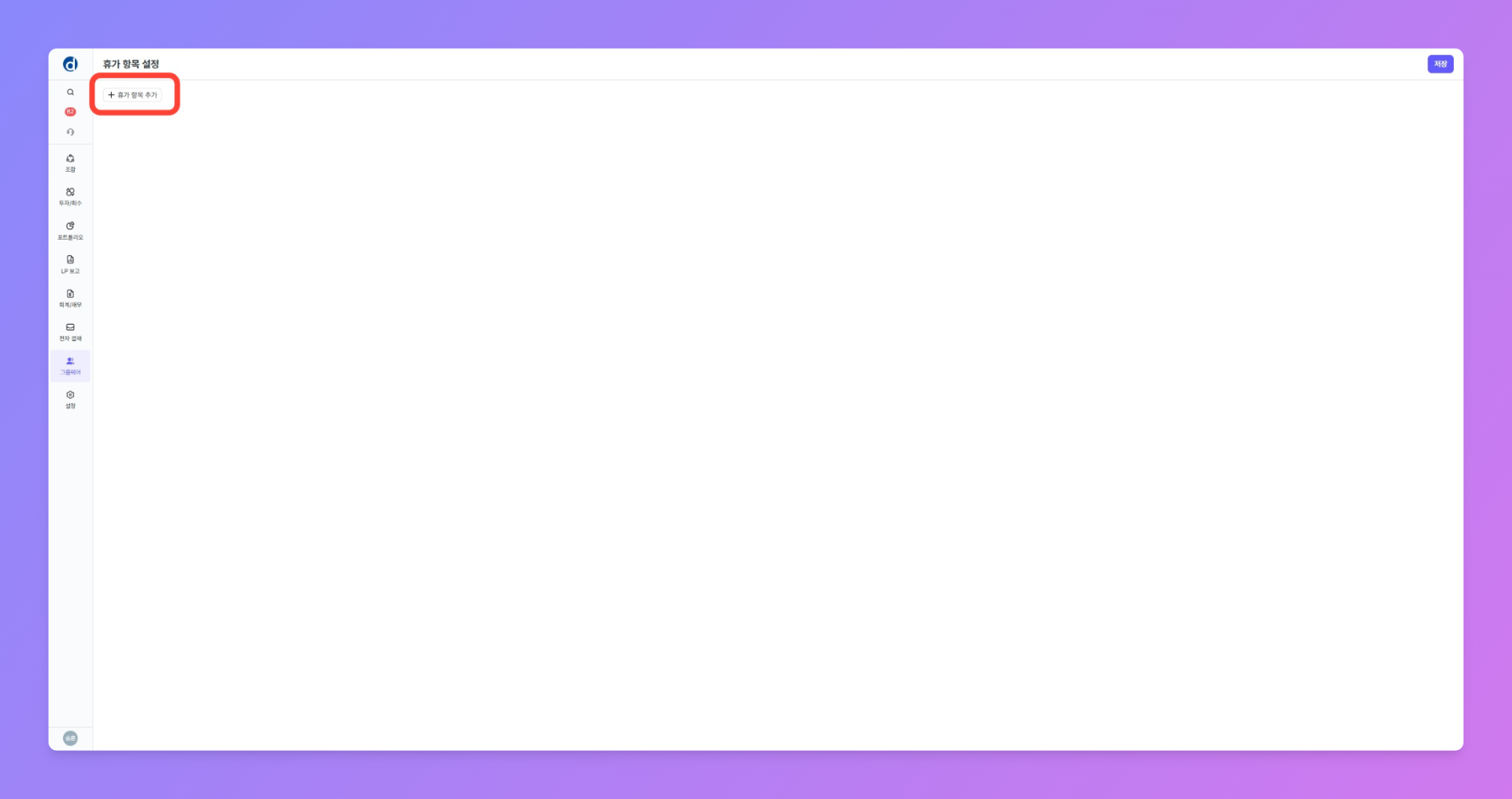 휴가 현황 관리 페이지로 이동 하셨다면, 좌측 상단의 [+ 휴가 항목 추가] 버튼을 클릭 해주세요.