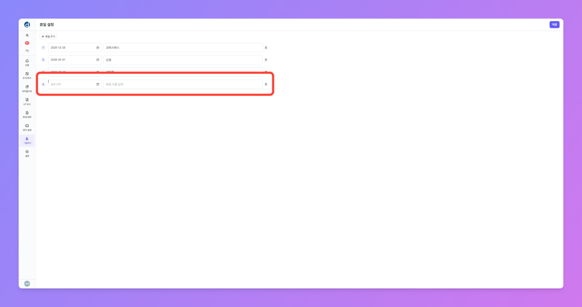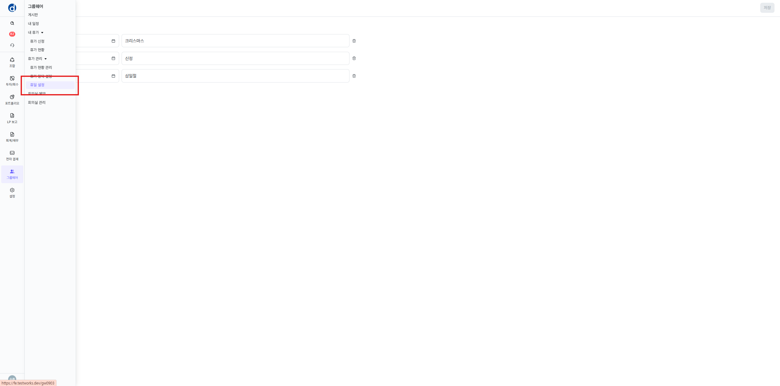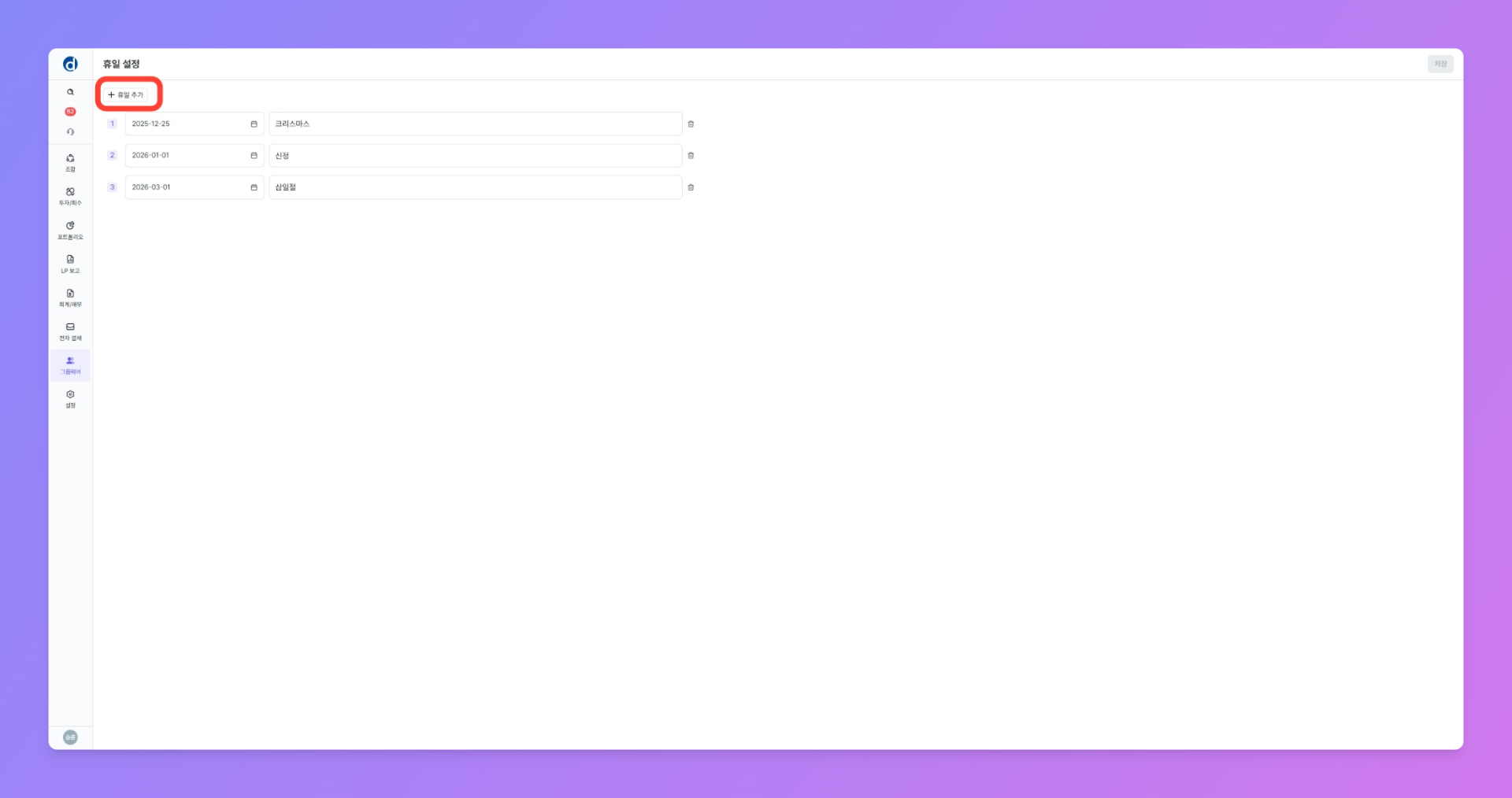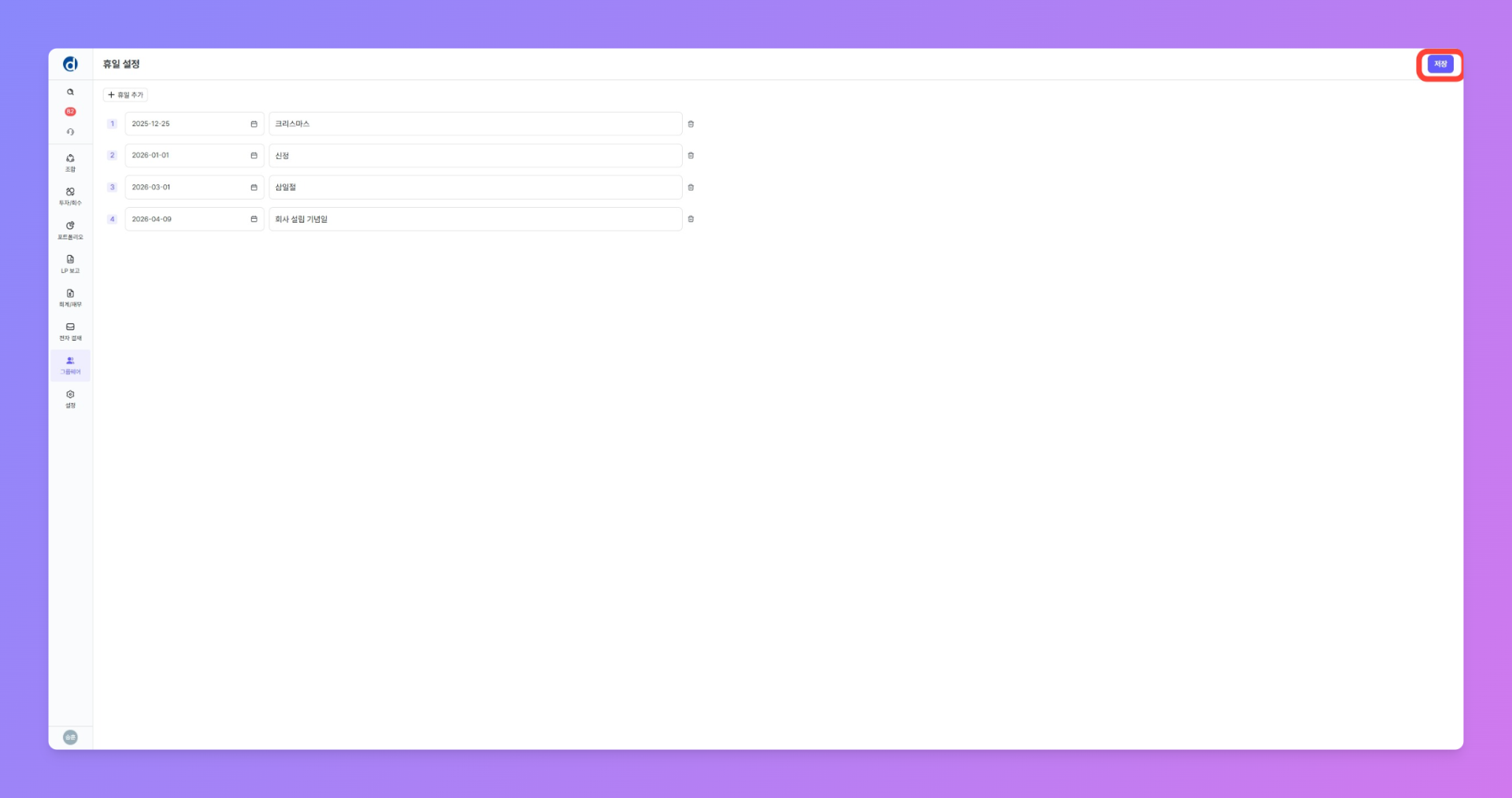 본 기능은 관리자가 회사의 휴무일을 지정하기 위한 절차입니다.